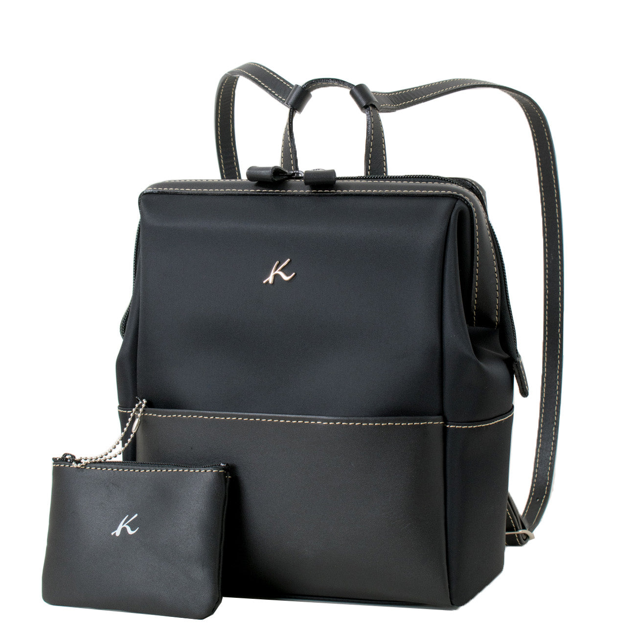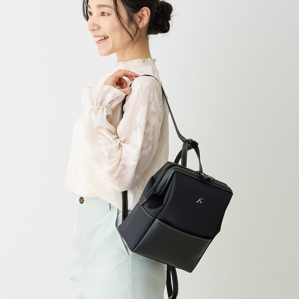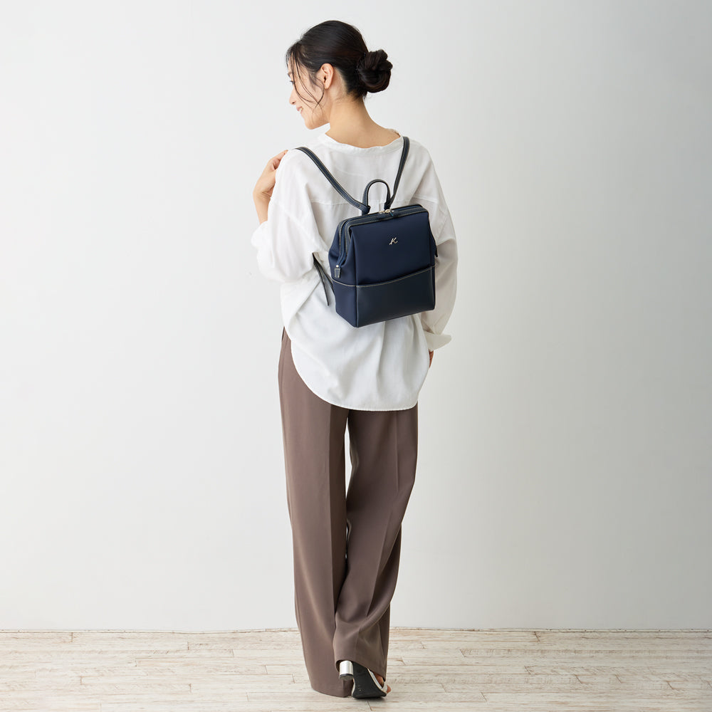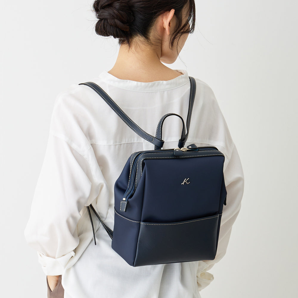 【内部】ファスナーポケット×1、オープンポケット×1 【外観】正面ファスナーポケット×1、底鋲あり、ミニポーチ付(H8.5×W12.5cm) |