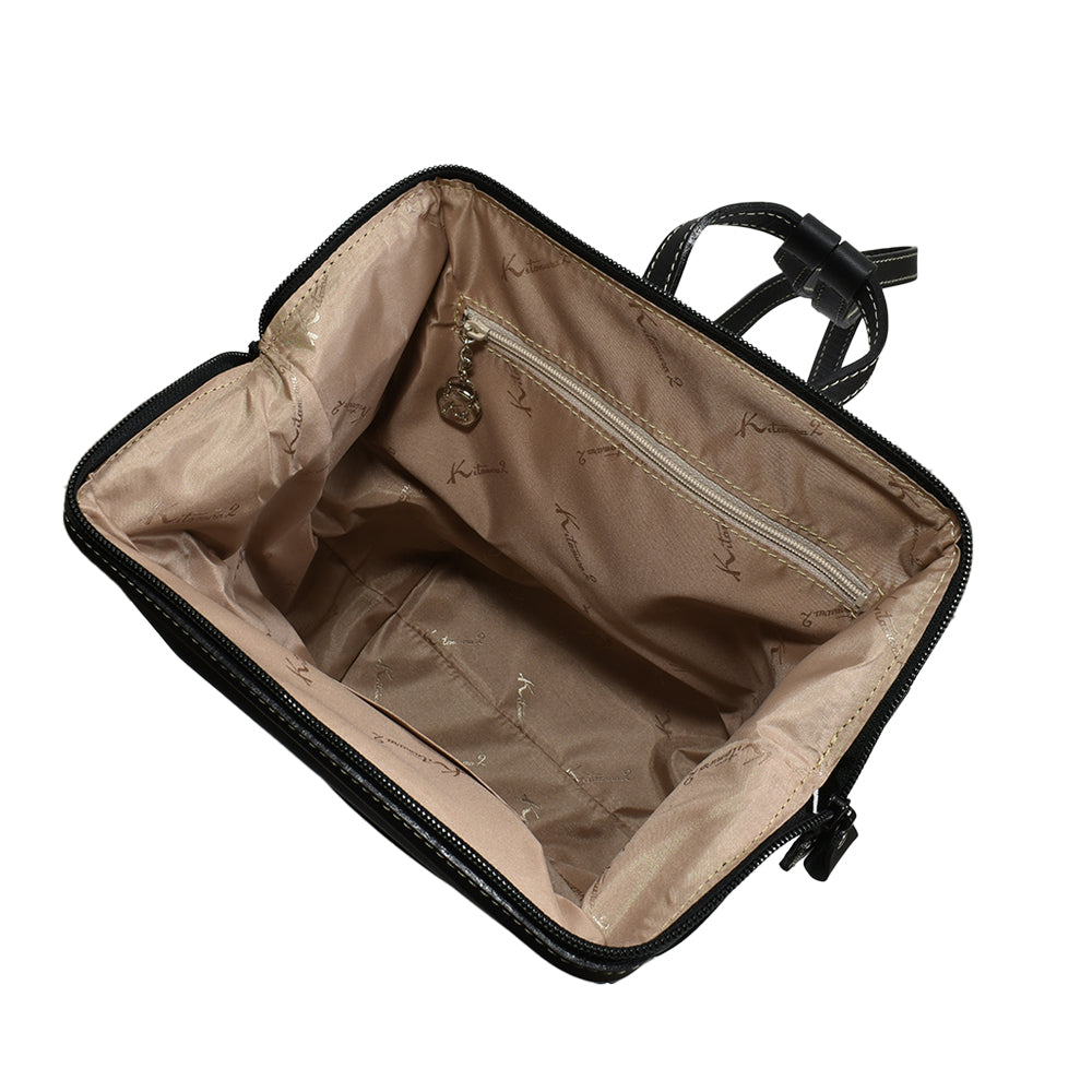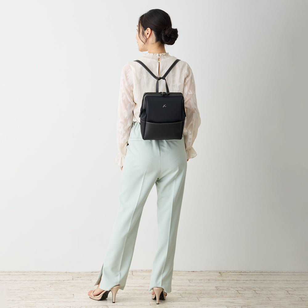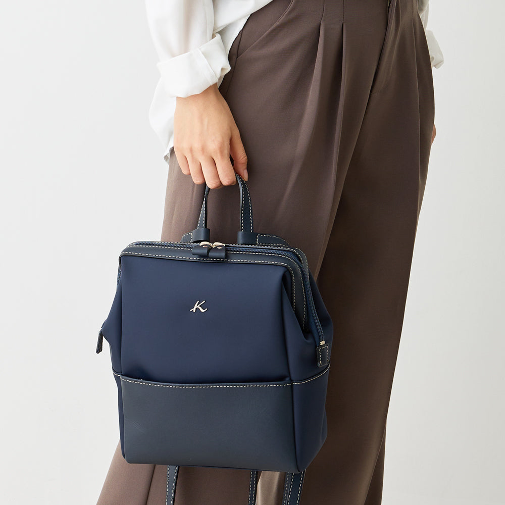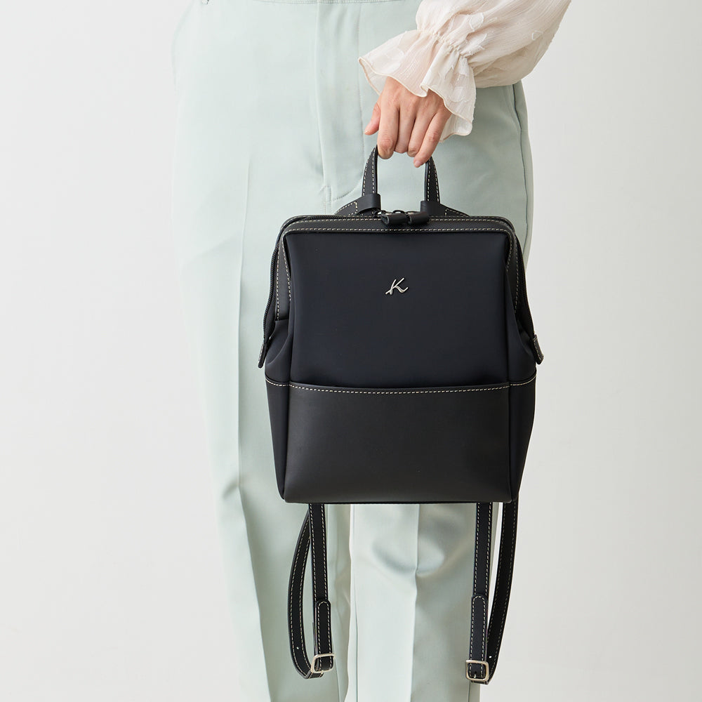 【内部】ファスナーポケット×1、オープンポケット×1 【外観】正面ファスナーポケット×1、底鋲あり、ミニポーチ付(H8.5×W12.5cm) |