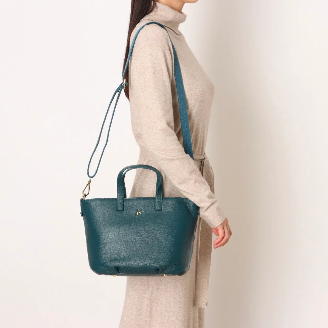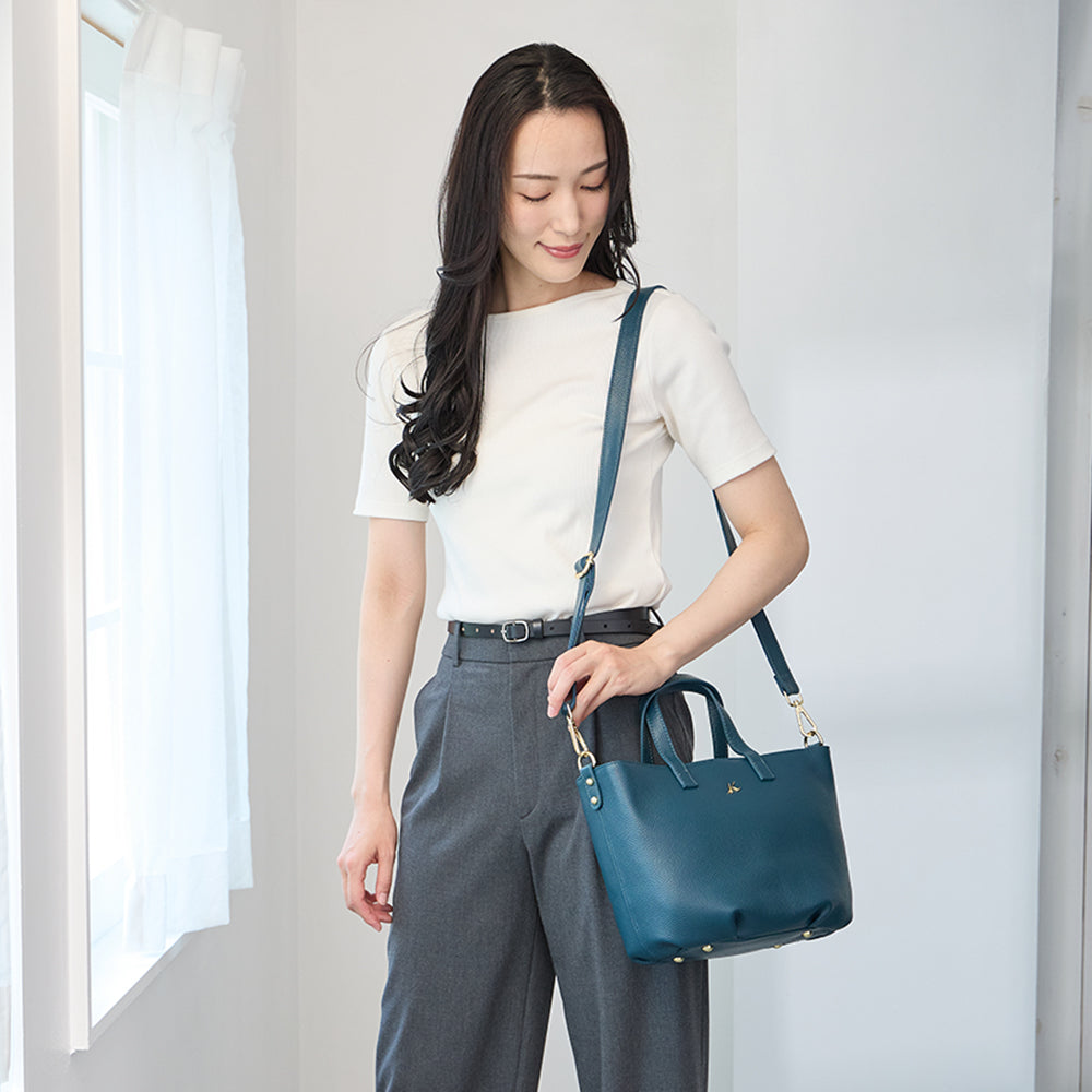 どんなスタイルにも合わせやすいショルダーベルト付き舟形ハンドバッグ。